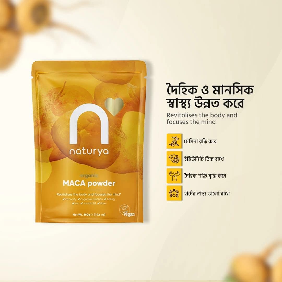 ম্যাকা রুট পাউডার প্রাকৃতিকভাবে ভিটামিন B2 (রাইবোফ্লাভিন) এবং আয়রন সমৃদ্ধ, যা ইমিউন সিস্টেমের স্বাভাবিক কার্যকারিতায় অবদান রাখে এবং ক্লান্তি ও ক্লান্তি কমাতে সাহায্য করে।